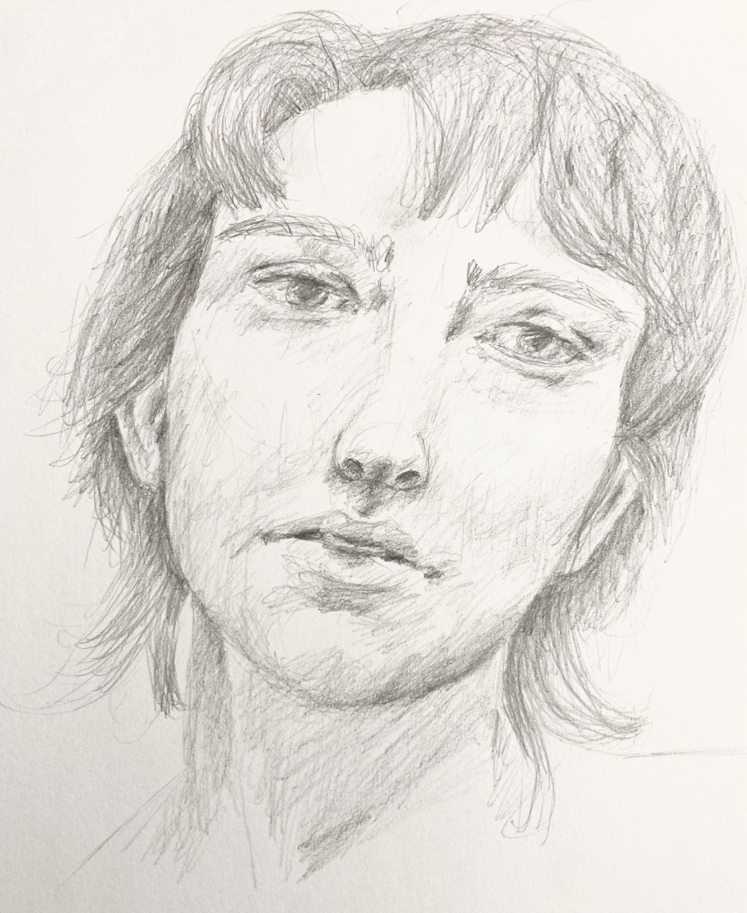 What’s more, this piece stylistically harkens back to my older works, back from when I was first learning portraiture in 2016. It has a patience, a deliberate approach that I resonated with in my classes years ago. I now like to work more quickly and loosely to retain energy and movement in line work. I do so to make pieces feel more alive than static.